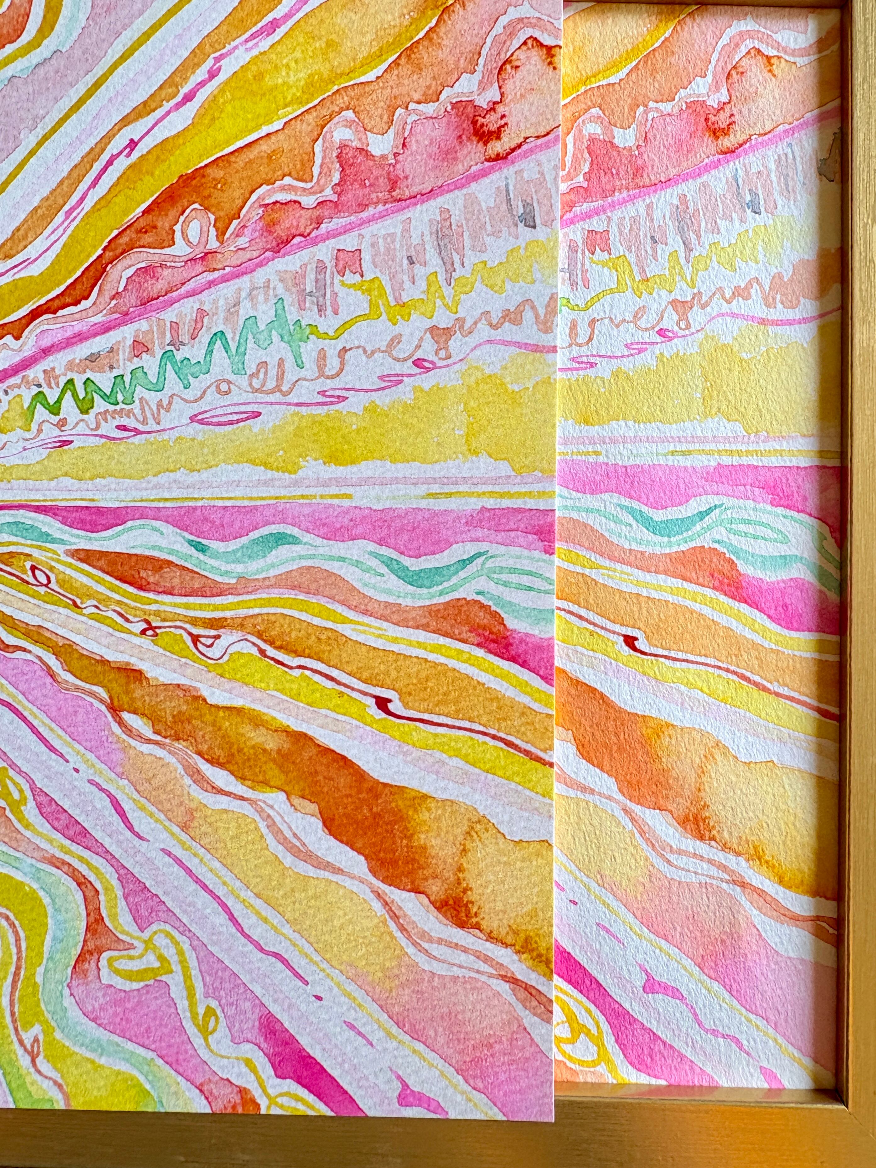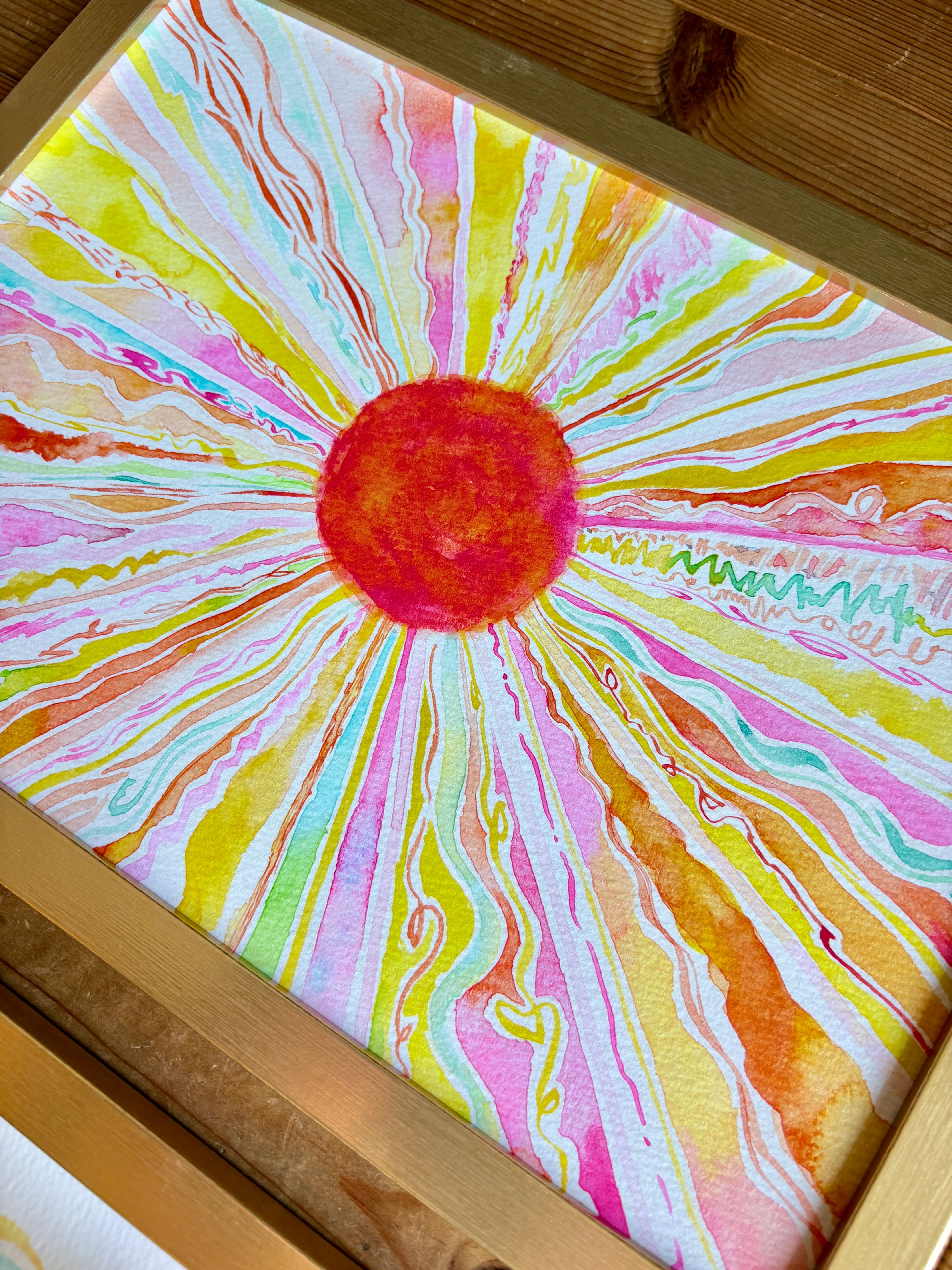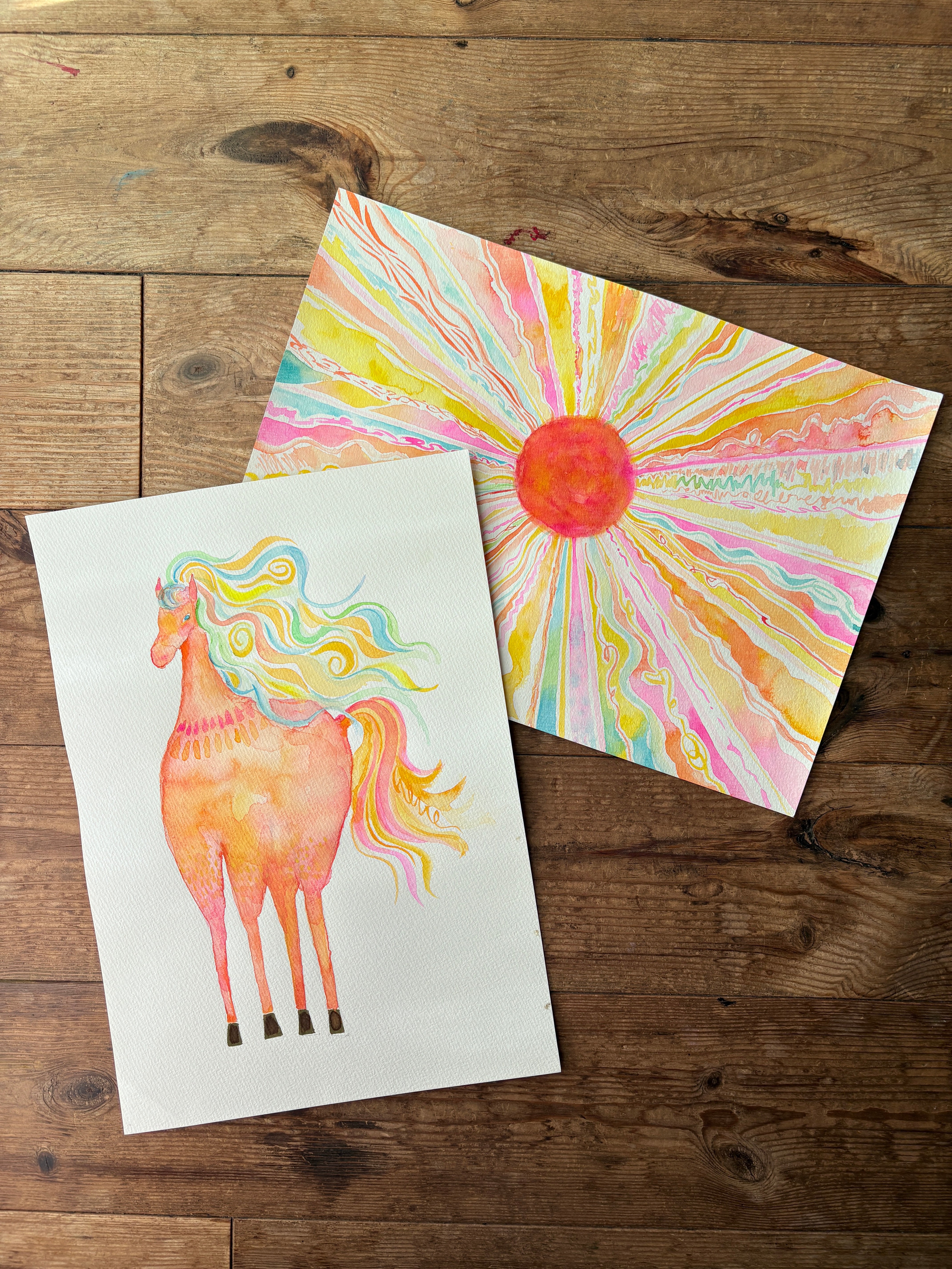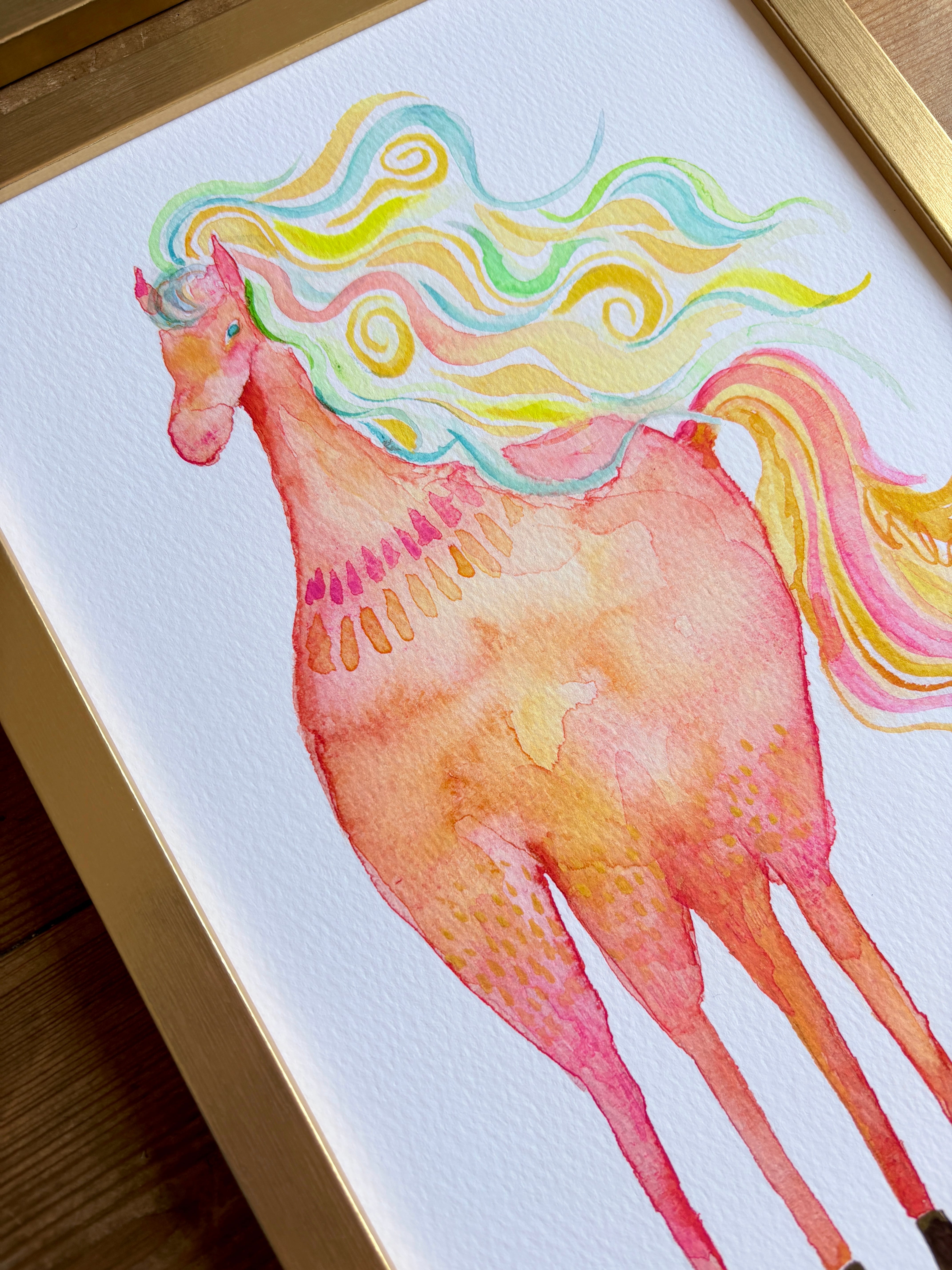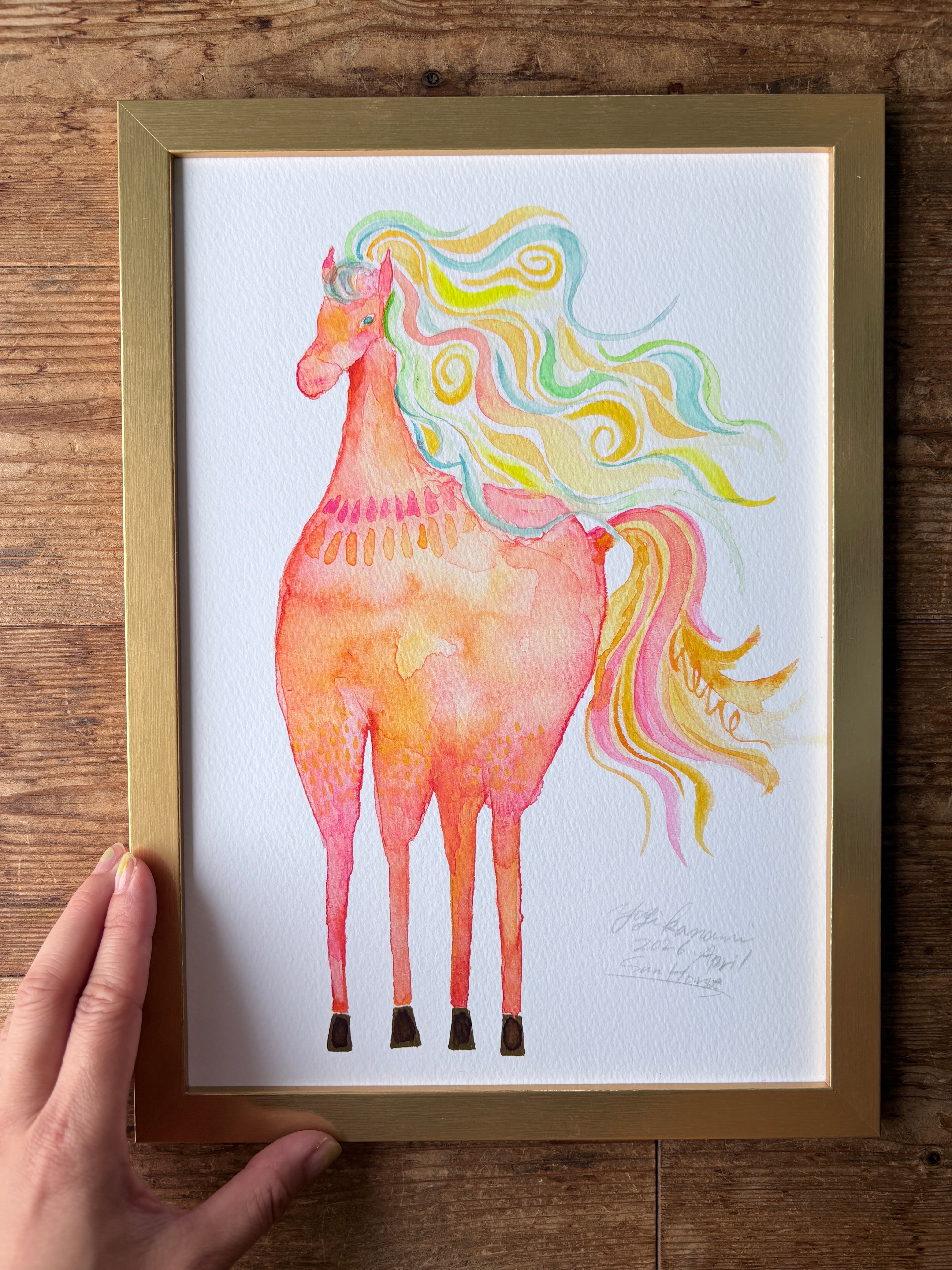 原画にそっくりな美しいジークレー印刷でプリントされたこの作品は、内なる光と力を感じることができる1組の作品です。算命学における「丙午(ひのえうま)」をテーマに、力強くも優雅な馬の姿が表現されています。原画はカラーインクや透明水彩で描きました。