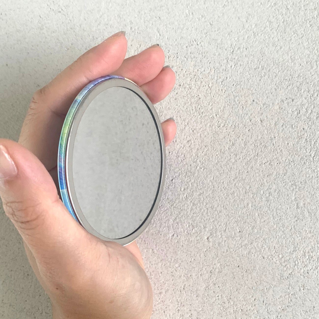 缶ミラーは直径76mmサイズ。手に持ちやすさと見やすさを兼ね備えています。マット印刷で落ち着いた印象です。